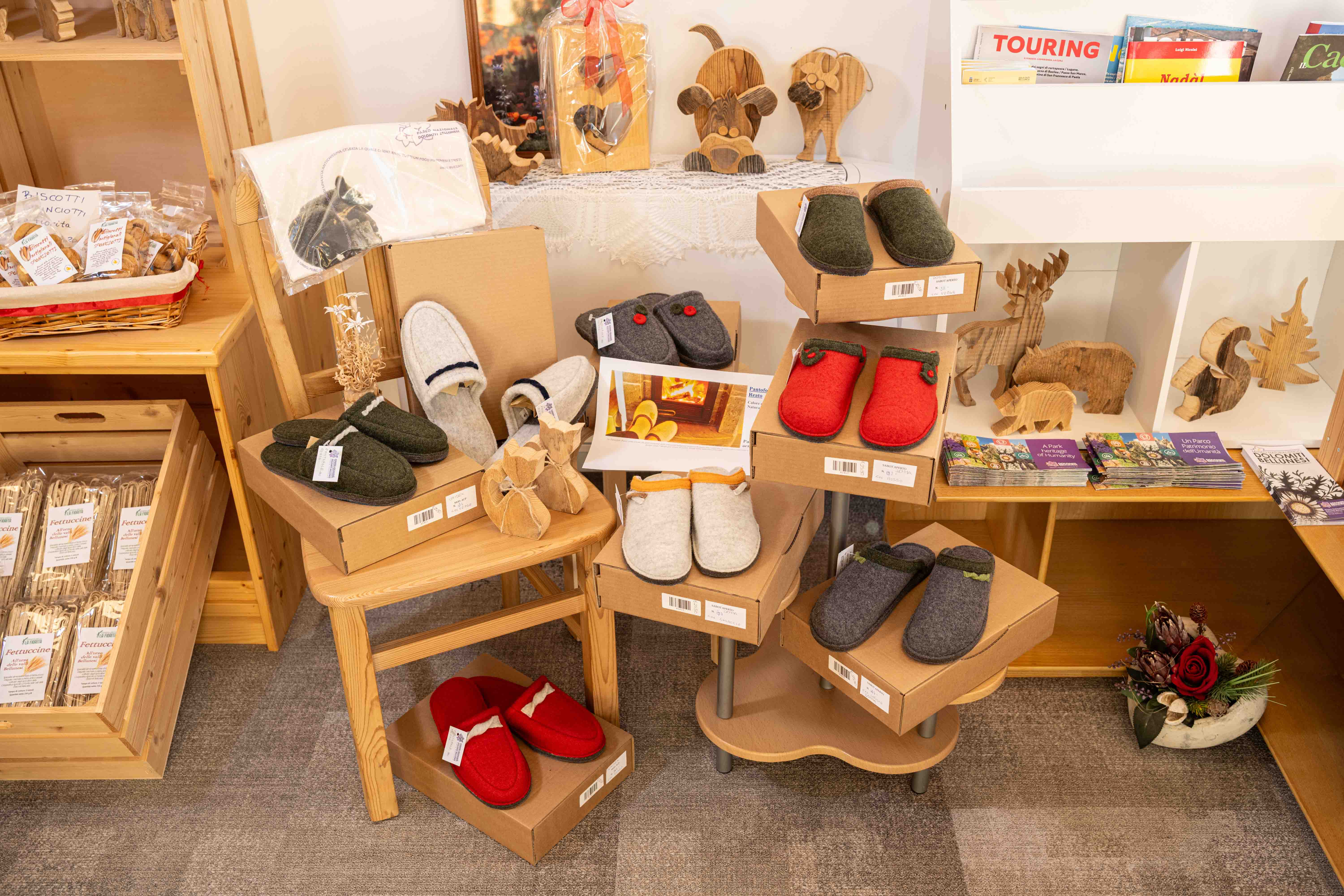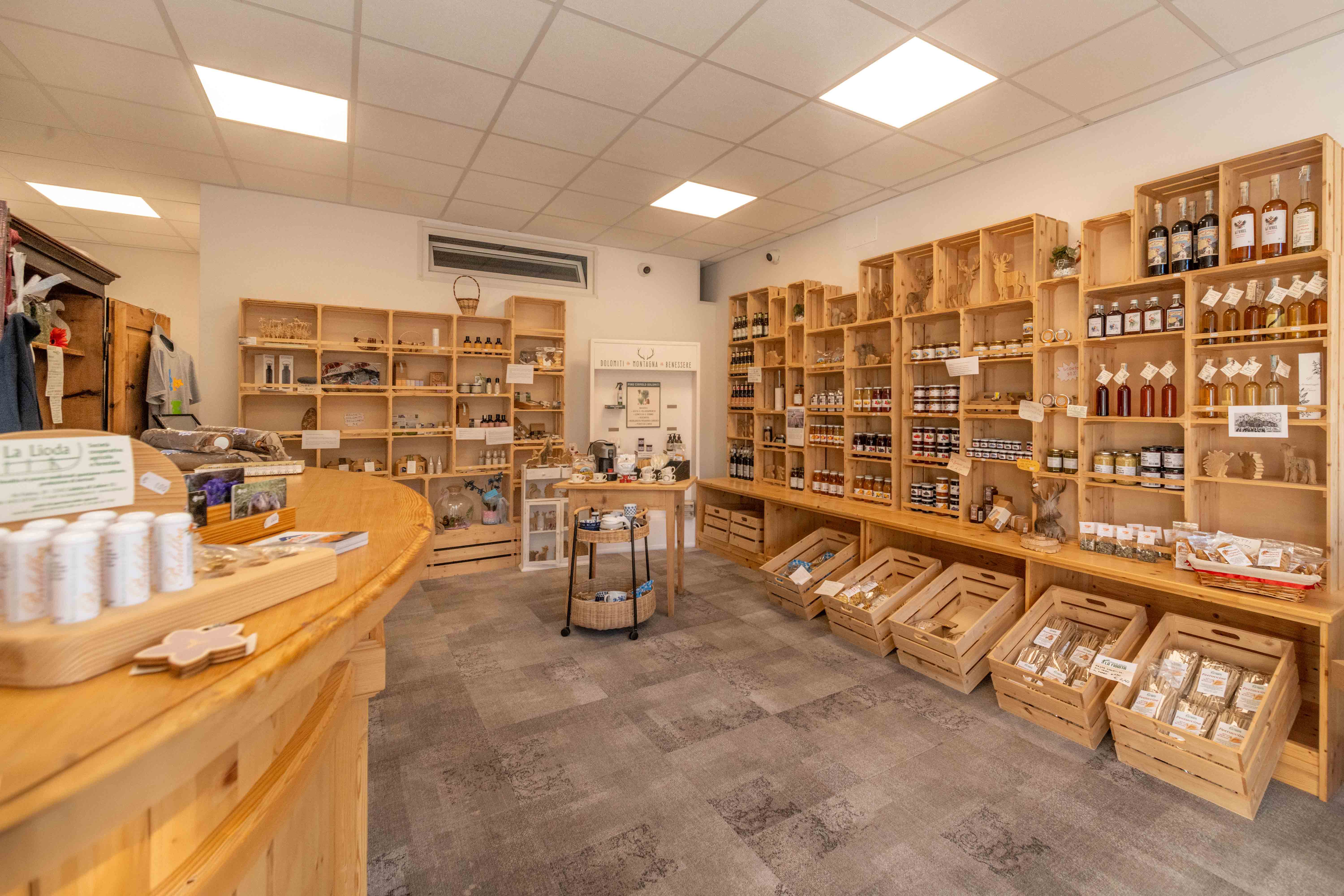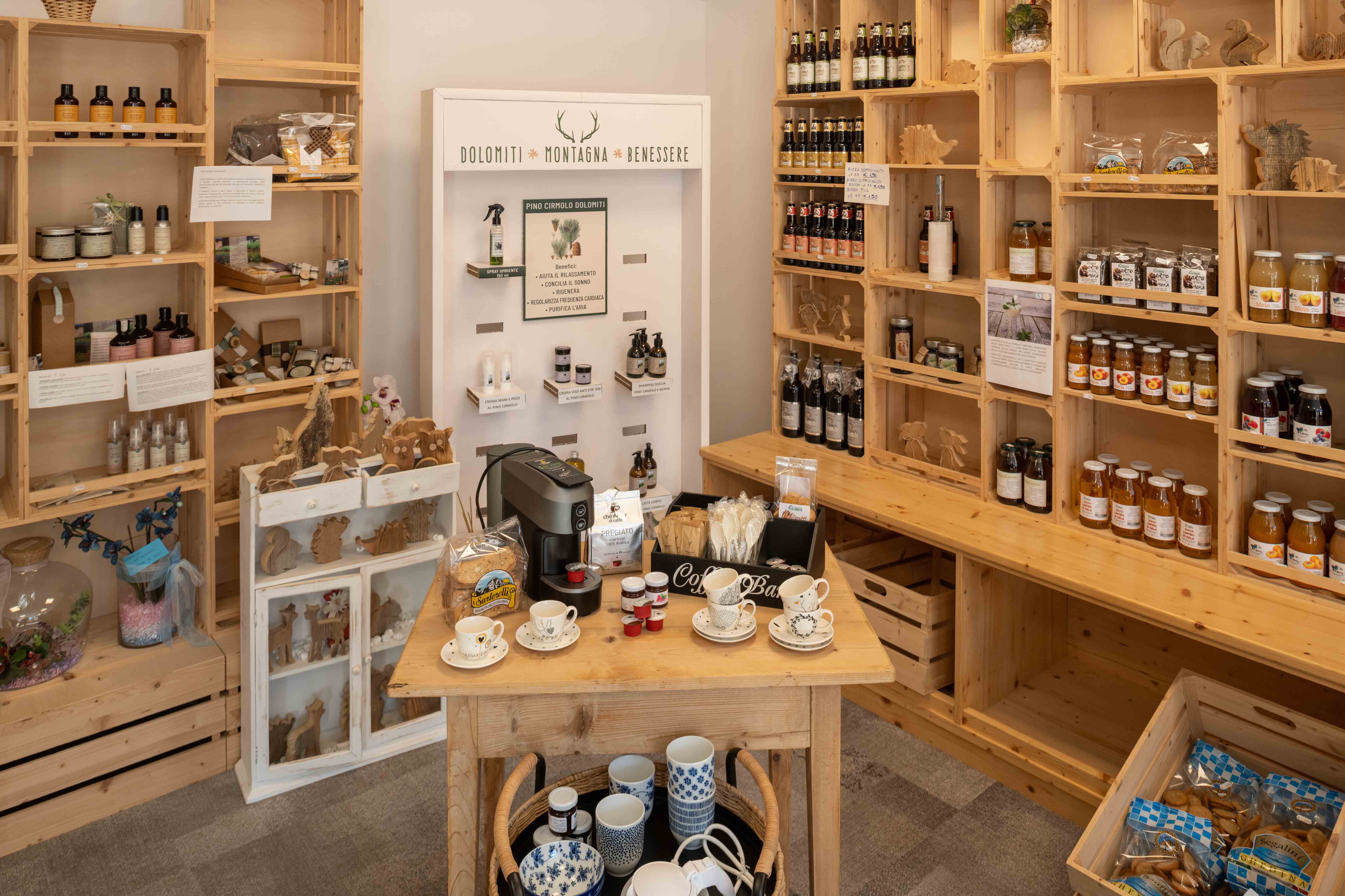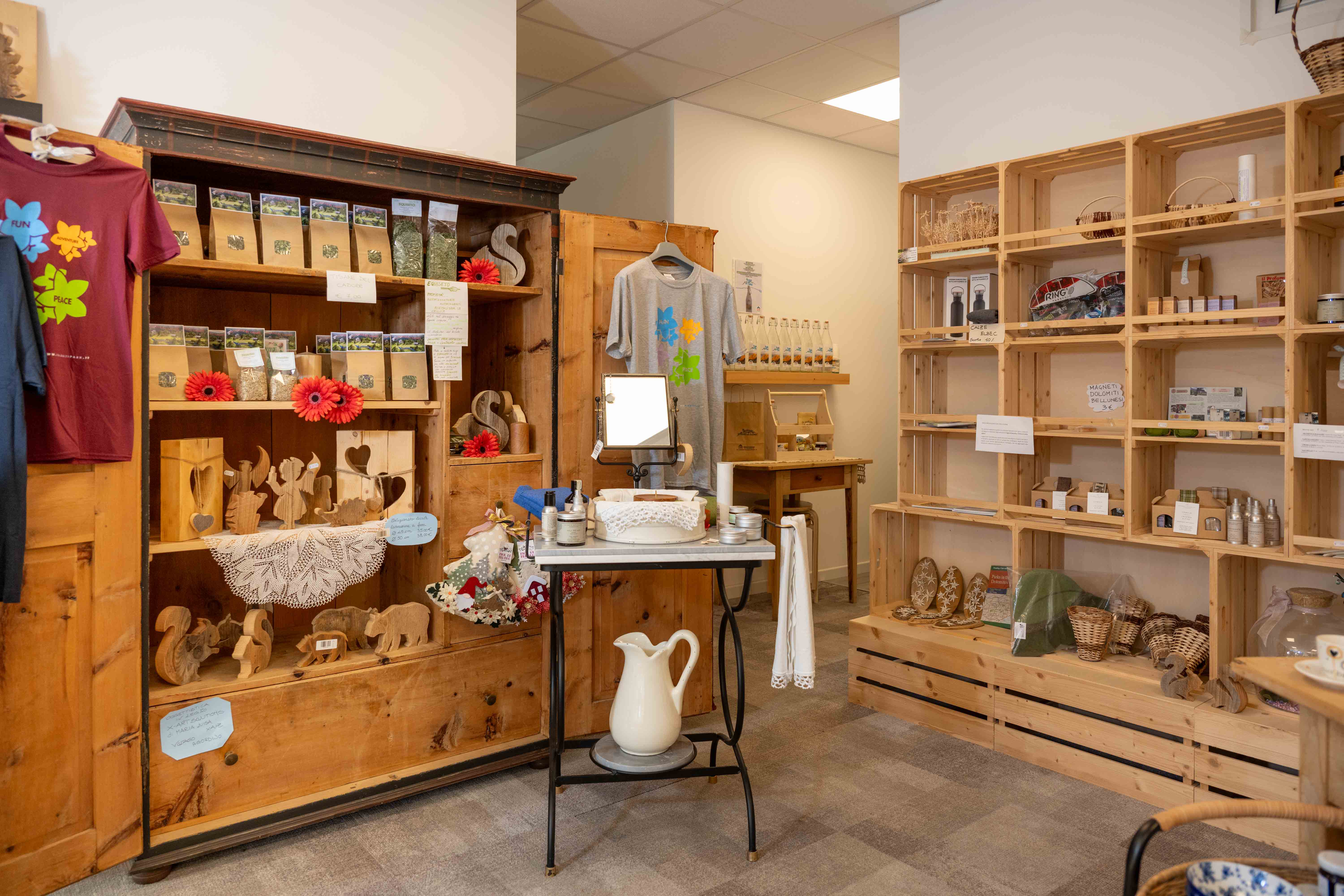 The Shop of typical products from the Dolomites: from wood art and painting, to local culture, from Pelmo sparkling or lightly sparkling water, to original Bellunese agricultural products, flours, fettuccine, spelt, barley, the Dolomites beer, cookies; syrups, jams, lavender oils, cirmolo pillows and lavender flowers, Cadore bitters, Cumin grappa; herbal teas; elderberry syrup; pumpkin seeds, toothpastes and creams, fruit juices, etc.